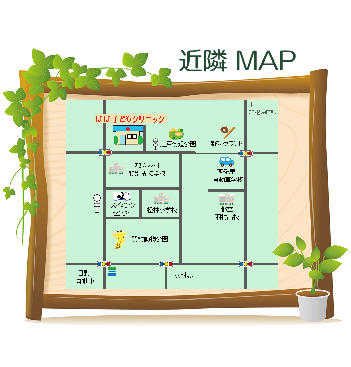 車でお越しの方 羽村駅・箱根ヶ崎駅から6-7分程度です。 都立羽村特別支援学校交差点を曲がってください。 瑞穂グラウンド横からの道は、若干道幅が狭いです。道なりに進むと当院です。 バスをご利用の方。 はむらん…羽村東コース:江戸街道公園下車。バス停から徒歩1分 立川バス…羽・17、羽・12系統、長岡循環にて、緑ヶ丘3丁目下車。バス停から徒歩5分