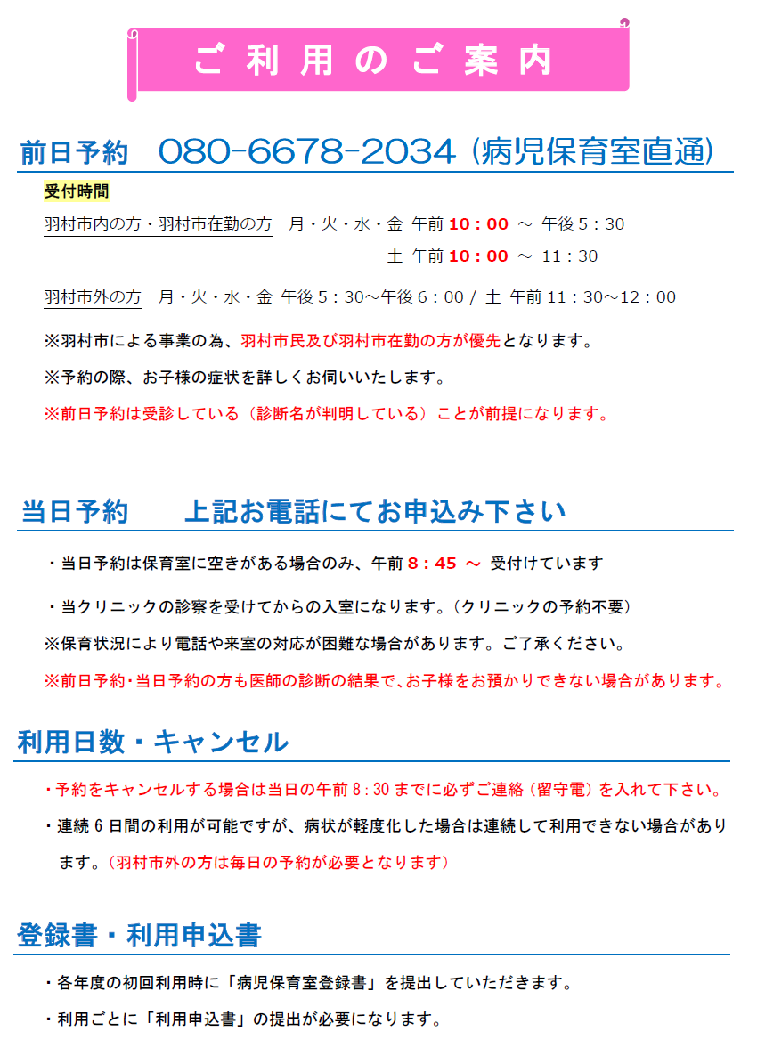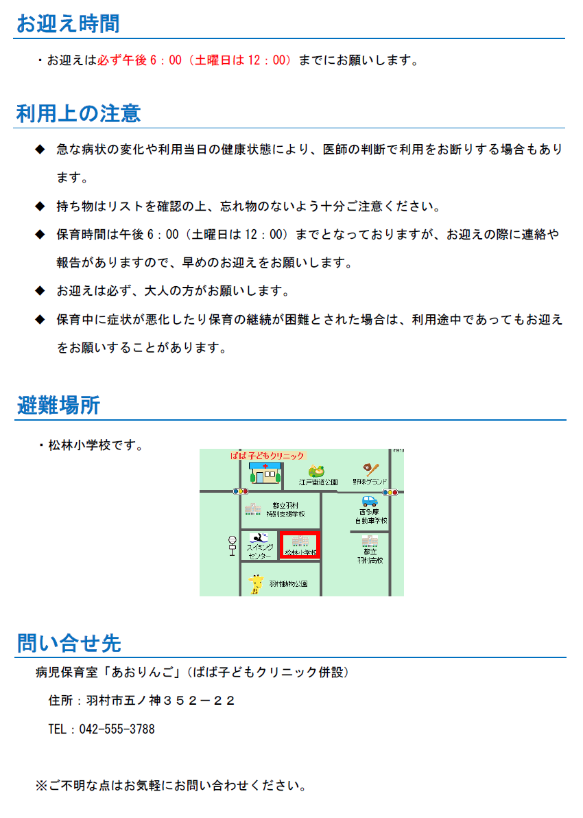 こちらからダウンロードしてご利用ください。ご家庭に印刷環境のない方は、クリニック・病児保育室に用意がございますので、お気軽にお尋ねください。